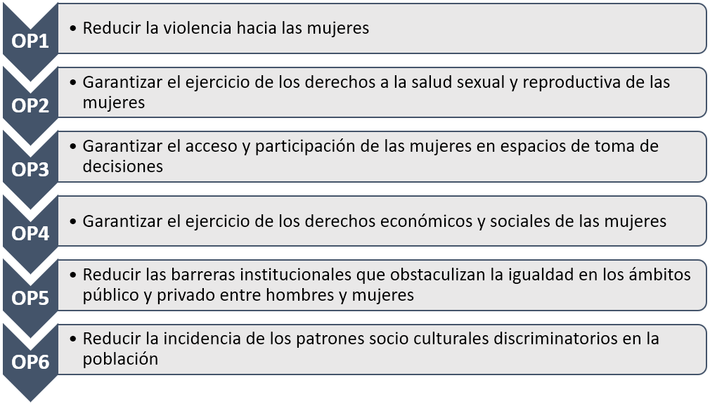 La Política Nacional de Igualdad de Género[1] constituye una política nacional multisectorial, cuya conducción está a cargo del Ministerio de la Mujer y Poblaciones Vulnerables (MIMP), entidad que lidera técnicamente su seguimiento y evaluación en el marco de sus competencias y funciones. La mencionada política plantea como estrategia la prestación de servicios priorizados que contribuyan en la reducción de las brechas basadas en género, orientados al cumplimiento de los seis objetivos prioritarios que son: